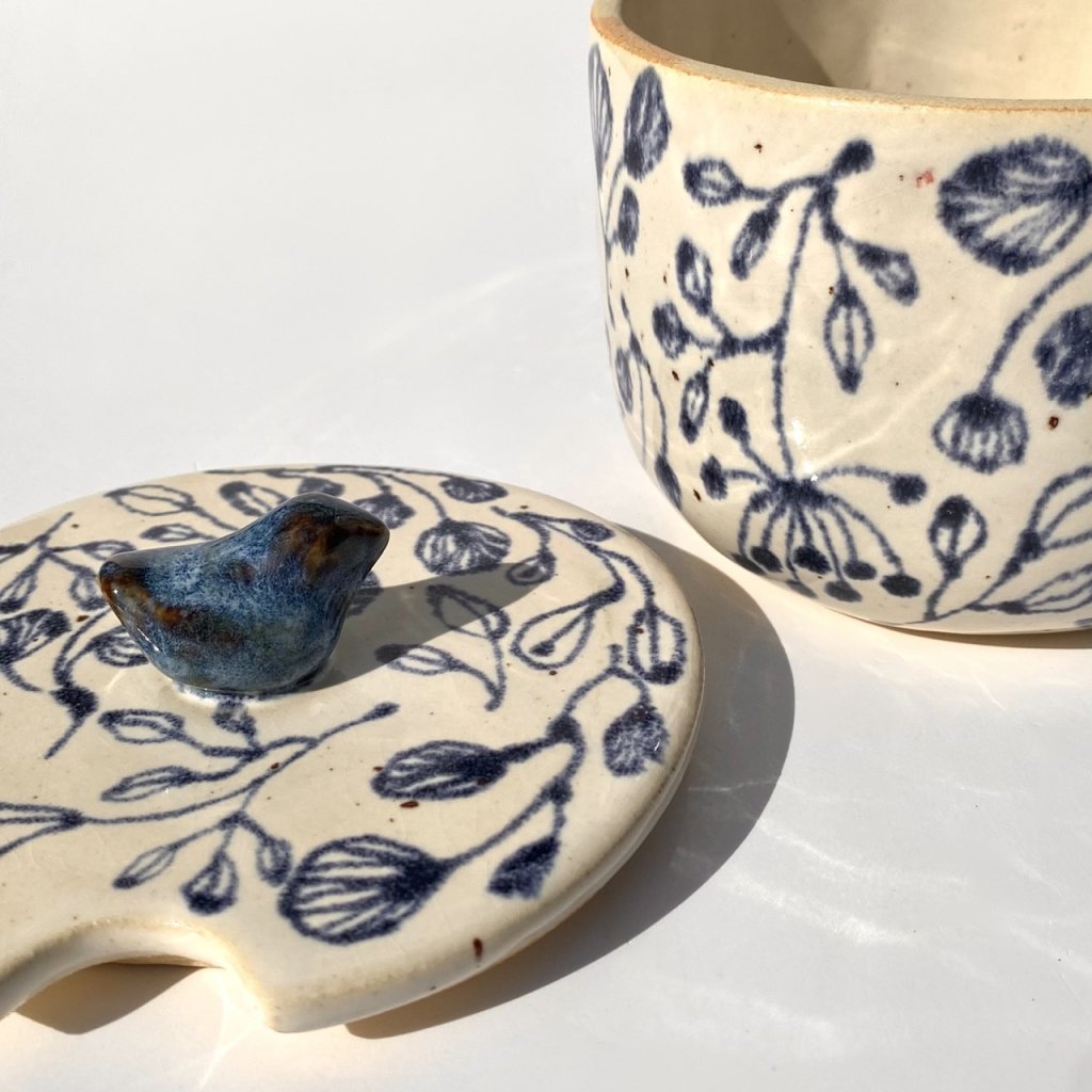 Cukřenka má objem 450 ml a vznikla z kameniny. Byla modelována v ruce přes formu, tudíž není točená a každý kus je tak trochu originál.