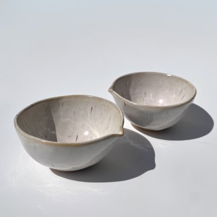 Miska má objem 300 ml a vznikla z kameniny. Byla modelována v ruce přes formu, tudíž není točená a každá je originál. Má vyvýšení podední a zobáček pro lepší přelévání hotového...
