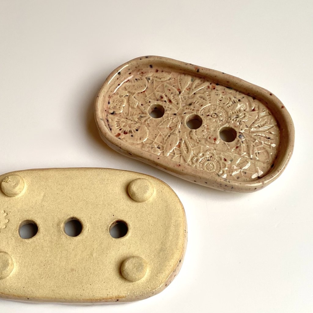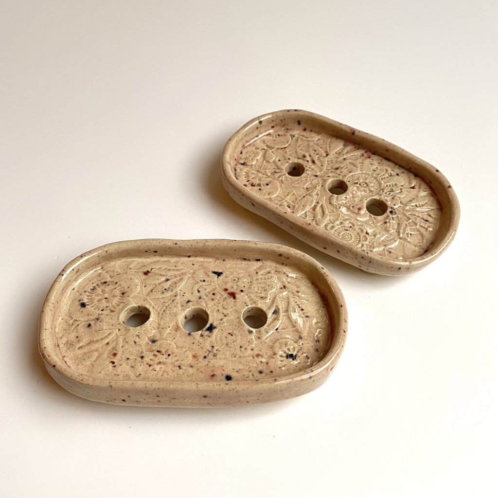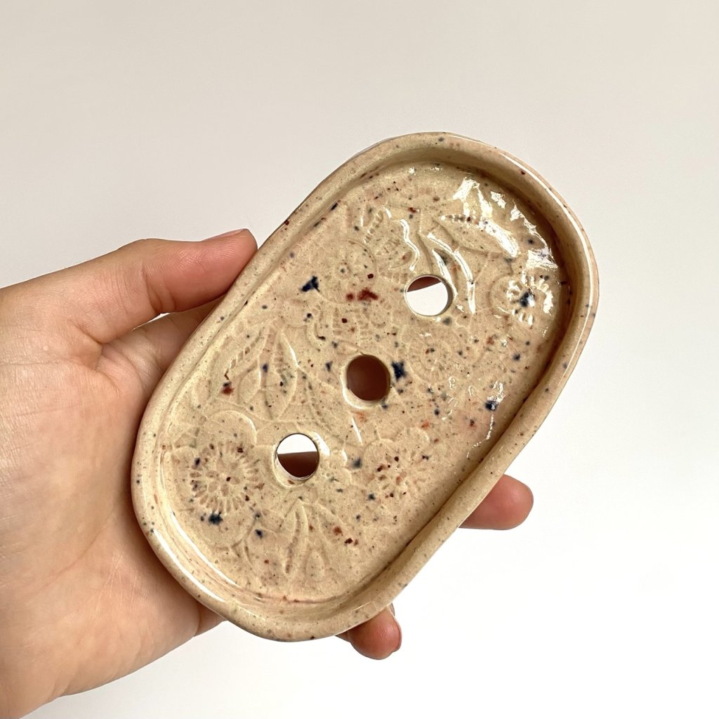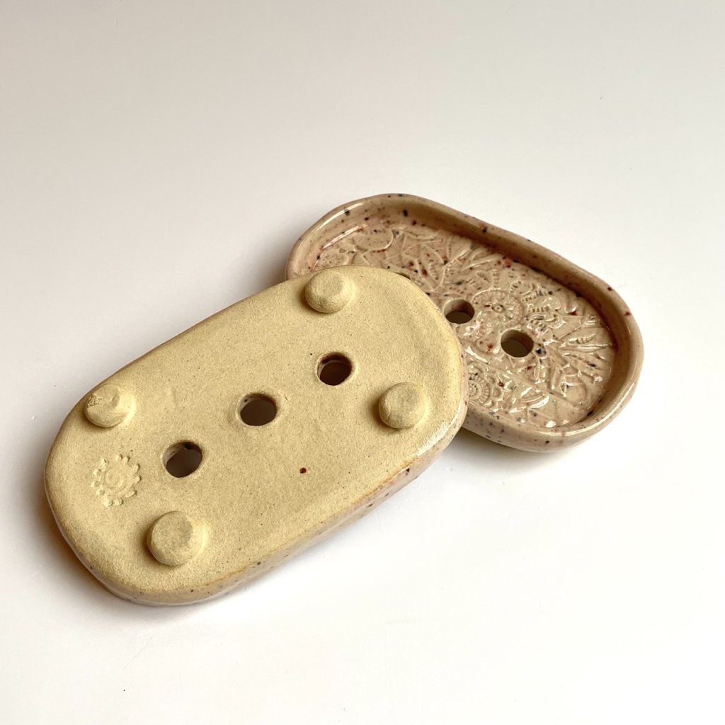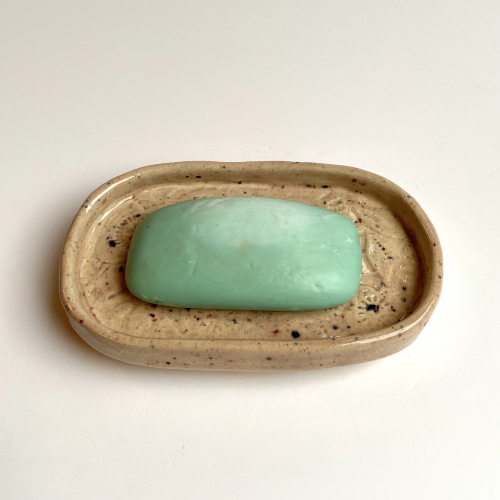 Keramická mýdlenka oválného tvaru. Délka 12 cm, šířka 7-8cm, výška 2,5cm, mýdlenka má čtyři kulaté nožičky.